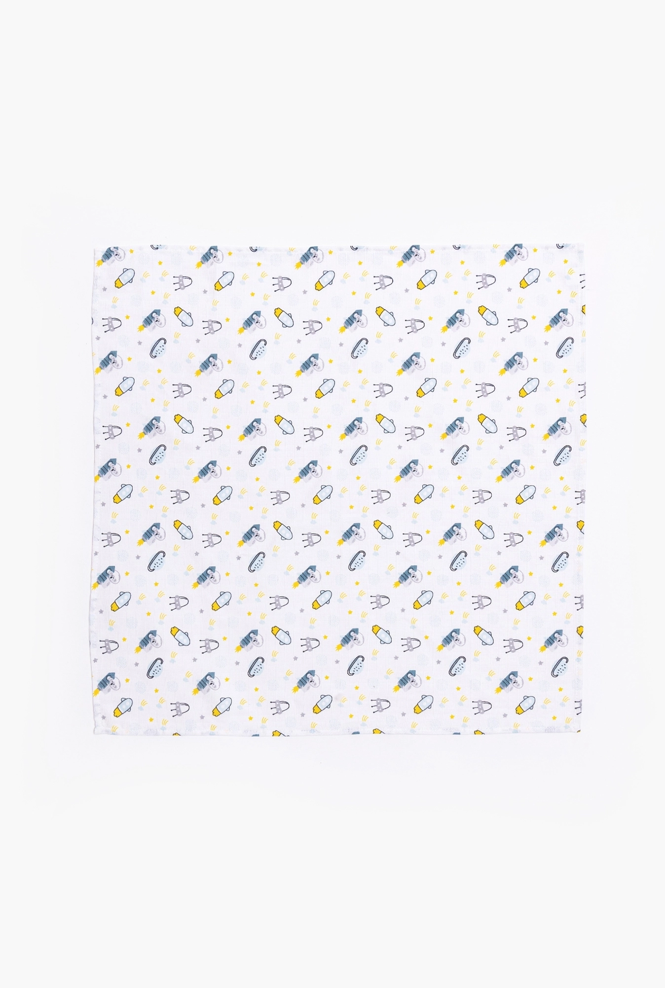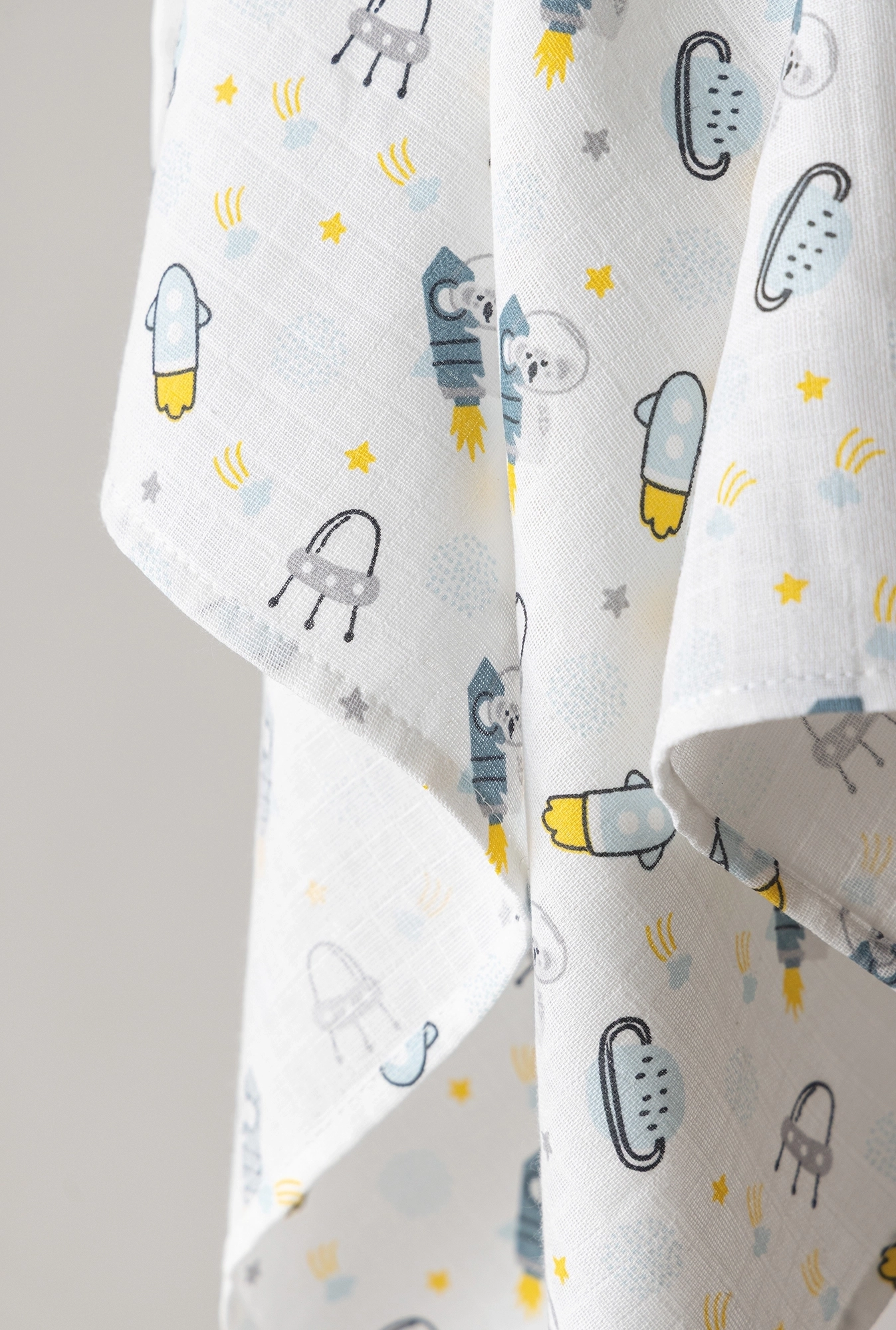 Muslin pelena za bebe od 100% pamuka sa razigranim svemirskim motivima. Lagana, prozračna i nežna za svakodnevnu upotrebu. Dimenzija 78x78.