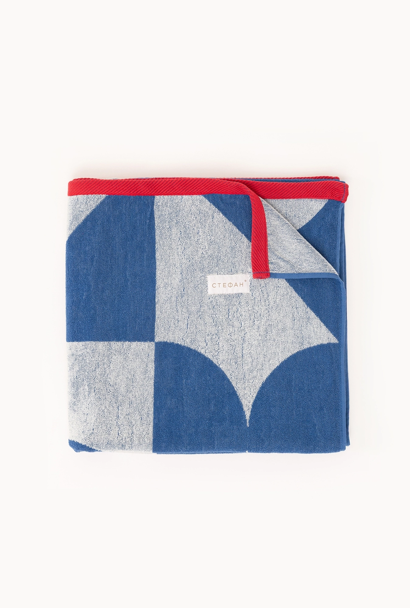Geometrijski dezen u plavo-beloj kombinaciji sa kontrastnim crvenim detaljima daje mu savremen i grafički snažan izgled – jednostavan, ali upečatljiv na prvi pogled.