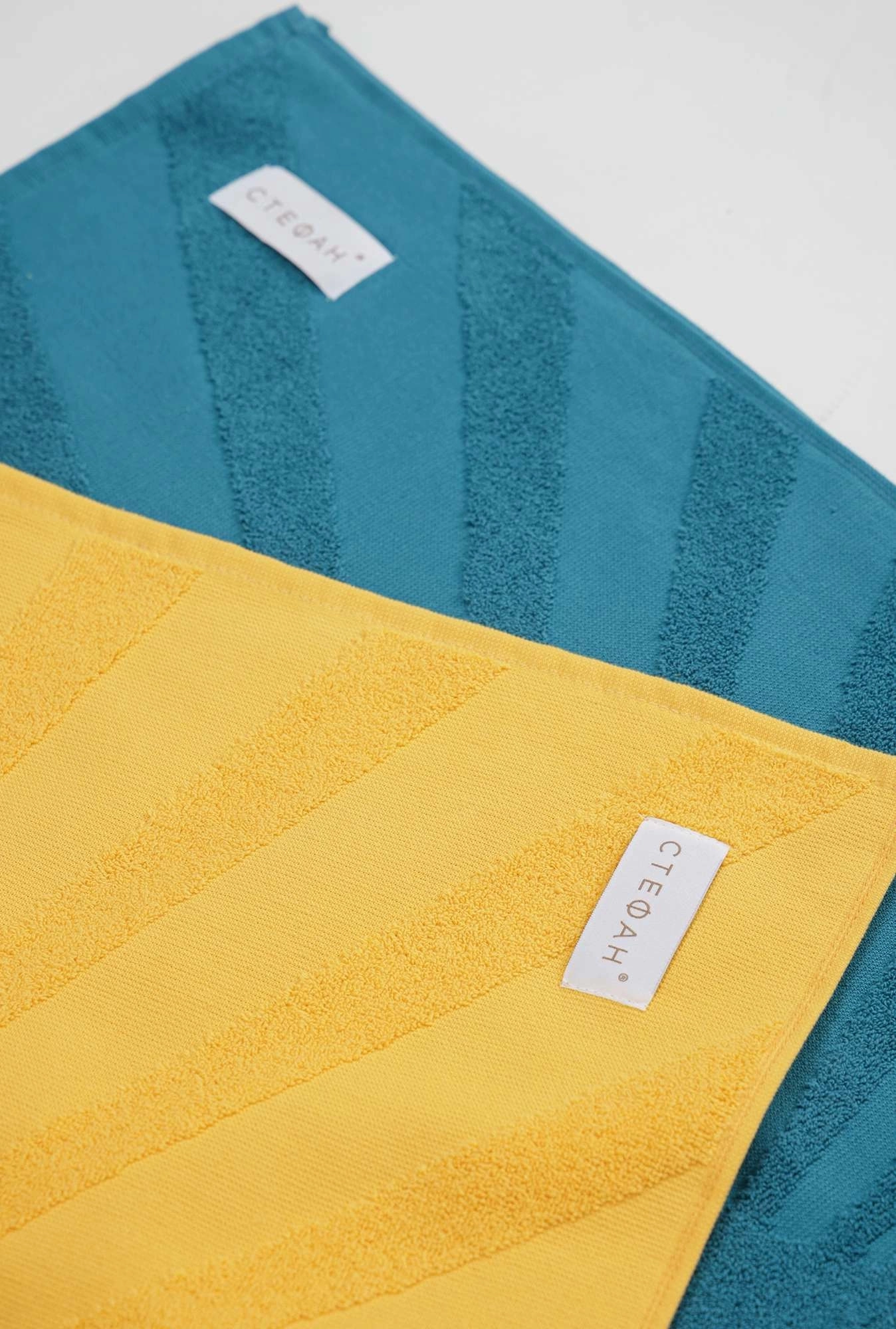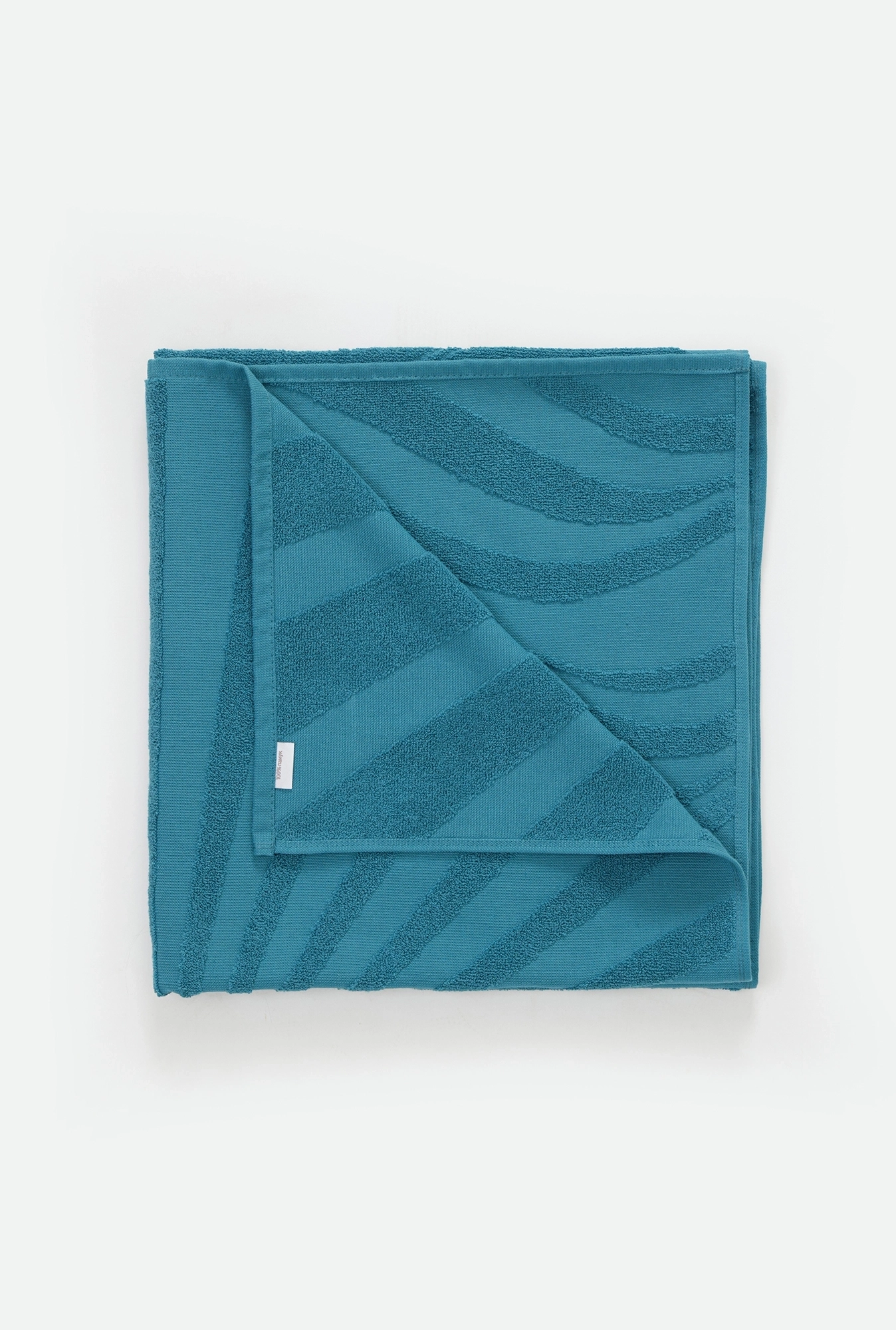 Reljefni dezen inspirisan talasima i zracima sunca daje peškiru diskretnu eleganciju i vizuelnu dinamiku, dok plava nijansa dodatno naglašava svežinu i letnji karakter proizvoda.