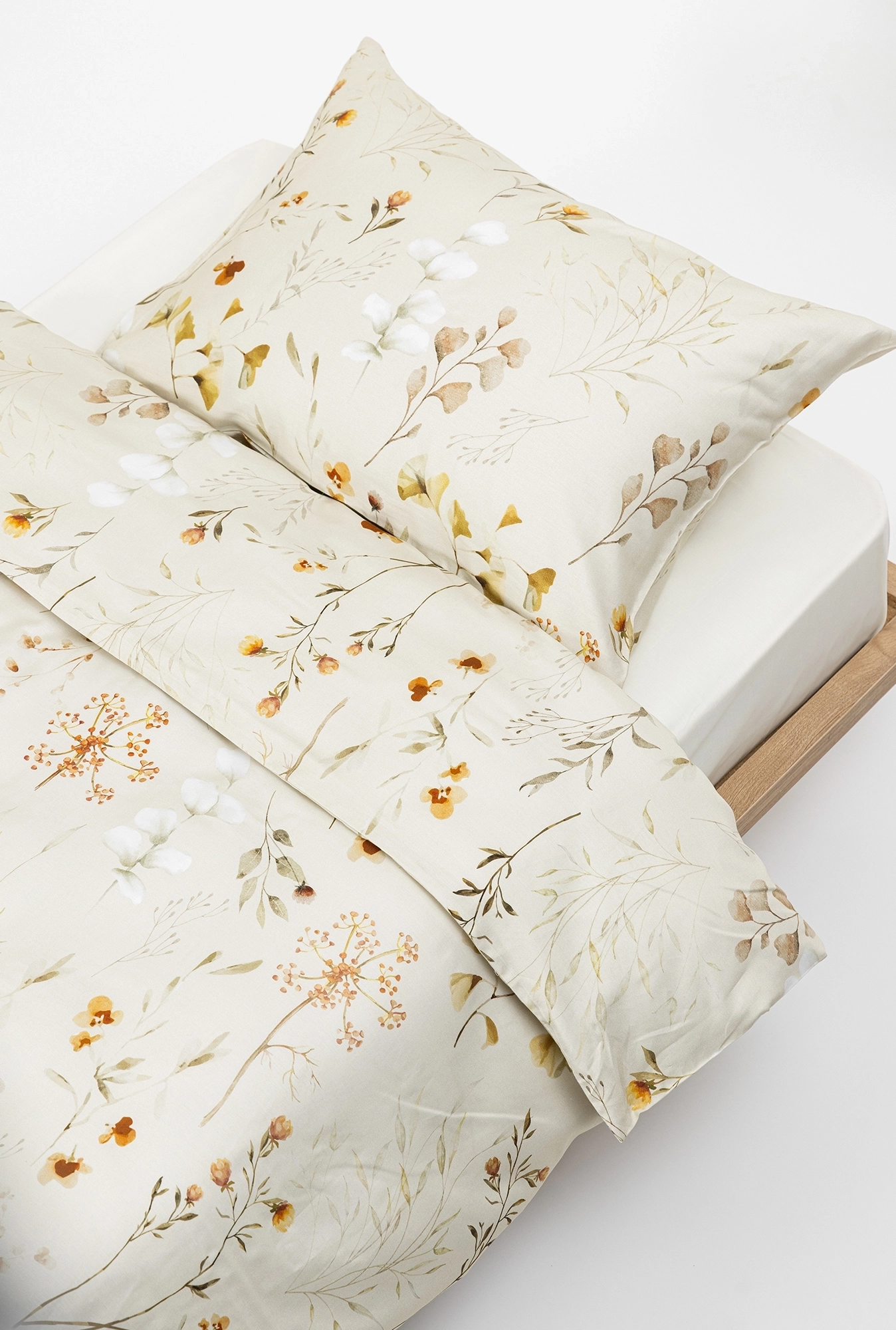 Posteljina „Prolećni herbarijum” izrađena je od 100% pamučnog satena, materijala koji kombinuje prirodnost pamuka i luksuzan, svilenkast dodir. Posebno tkanje daje tkanini glatku, blago sjajnu površinu, zbog čega je izuzetno prijatna na koži i idealna za udoban san tokom cele godine.