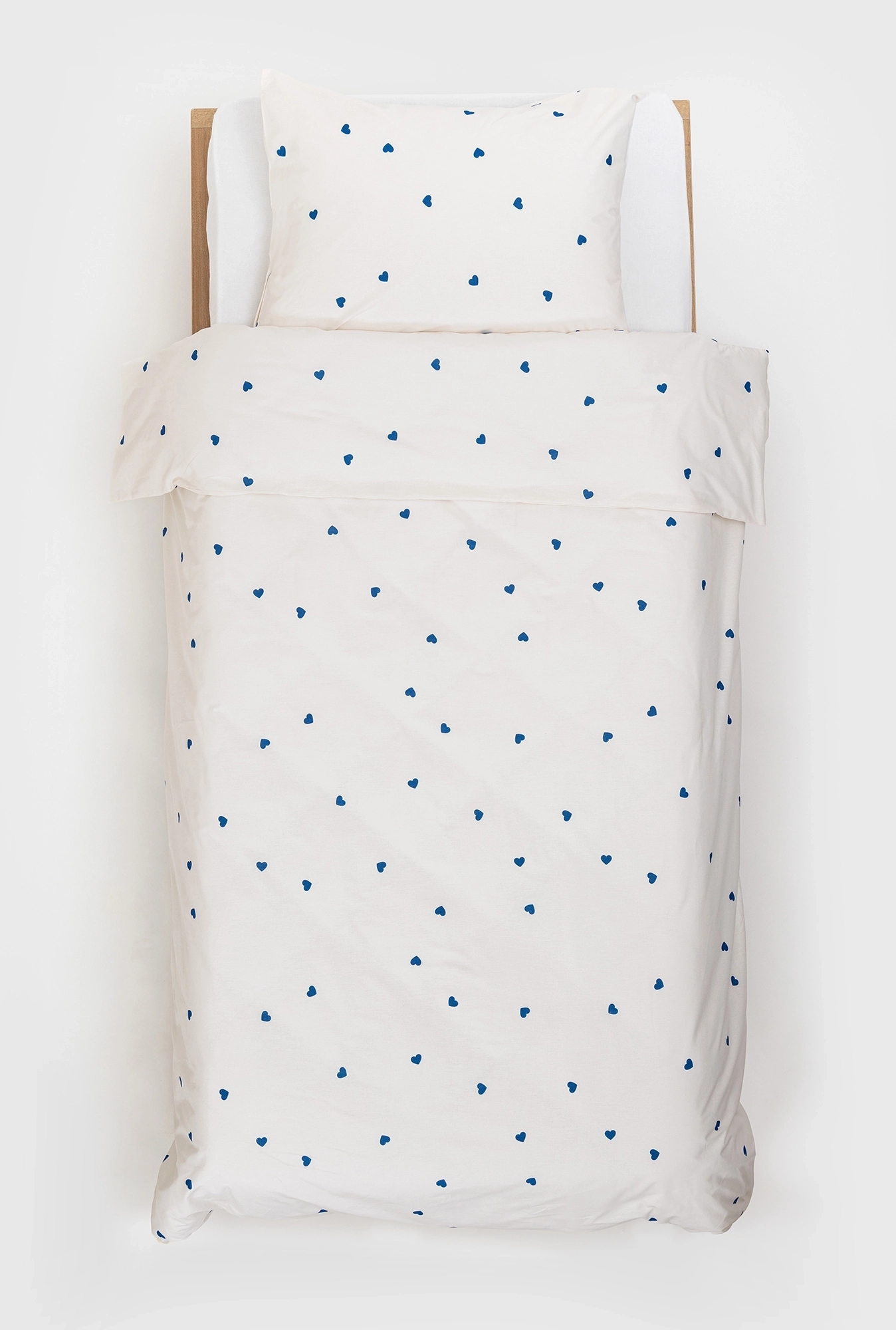 Posteljni set Bež srce od 100% pamuka sa jorganskom navlakom i jastučnicama. Nežan dezen, kopčanje na dugmiće, za singl i bračni krevet.