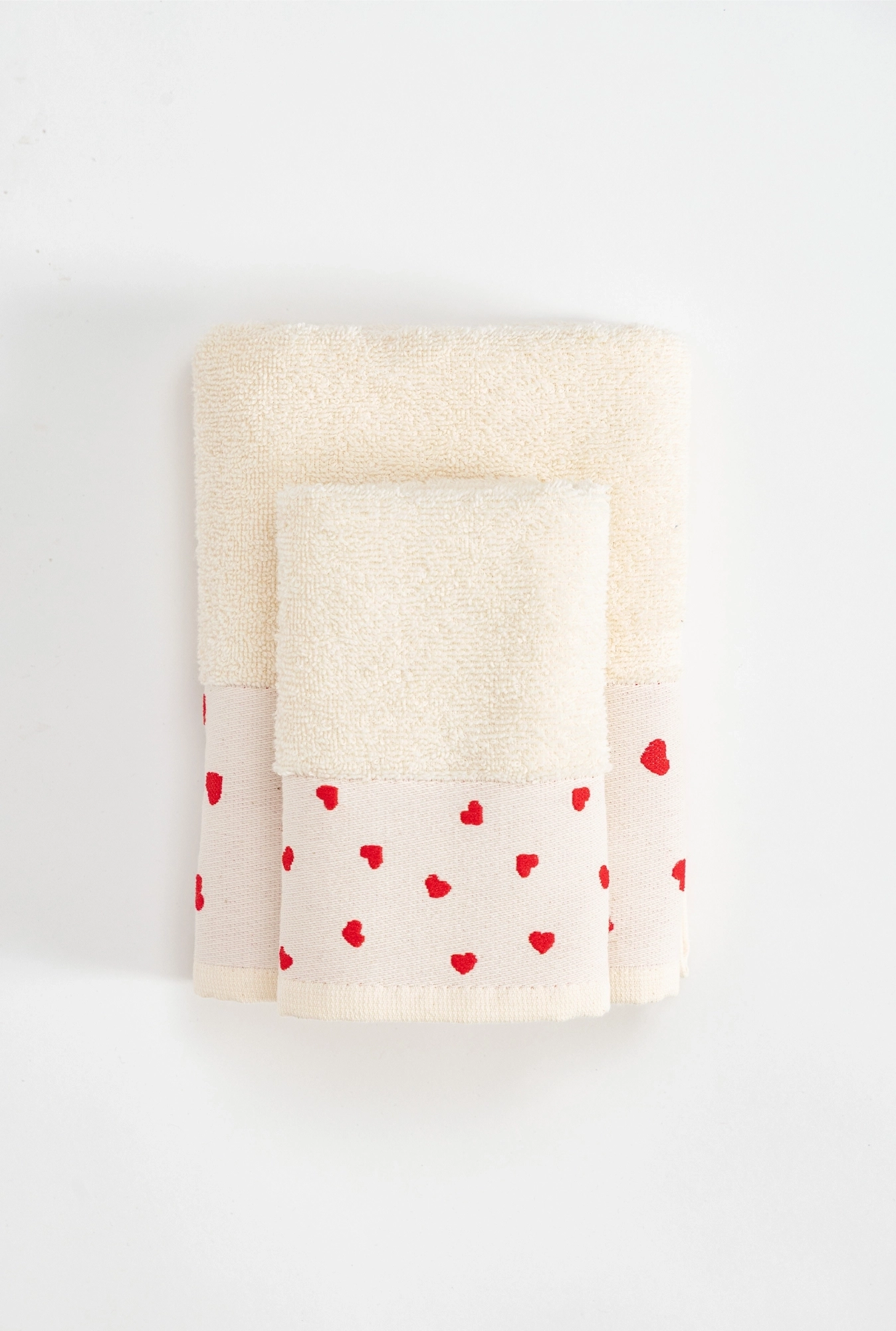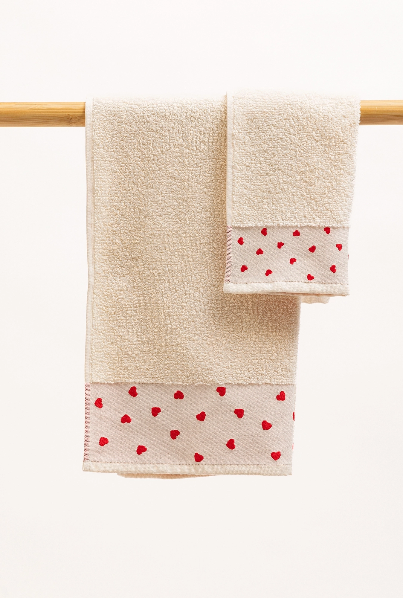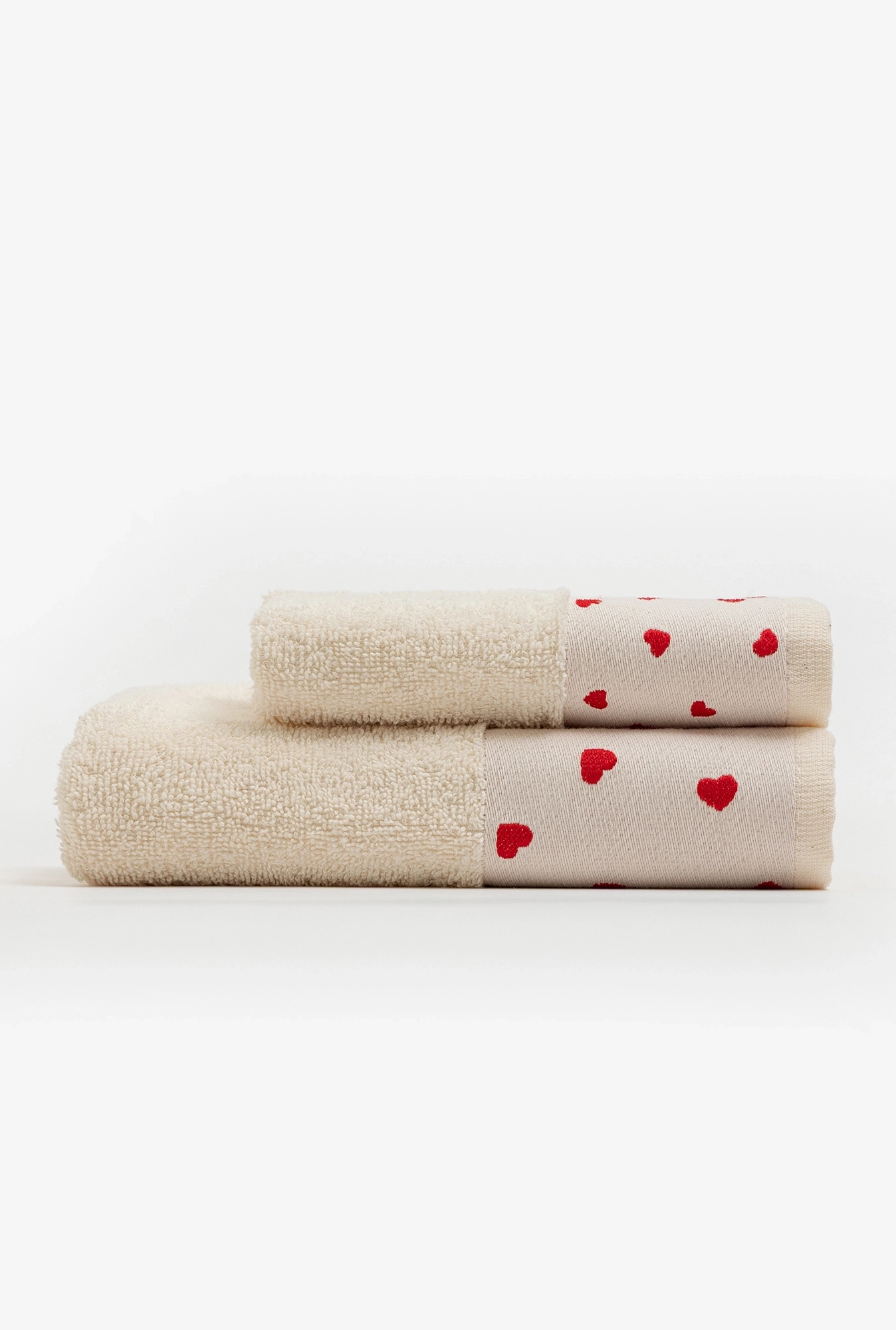 Bež set peškira sa izvezenim crvenim srcima od 100% pamuka, 400 g/m². Nežan, praktičan i savršen kao poklon.