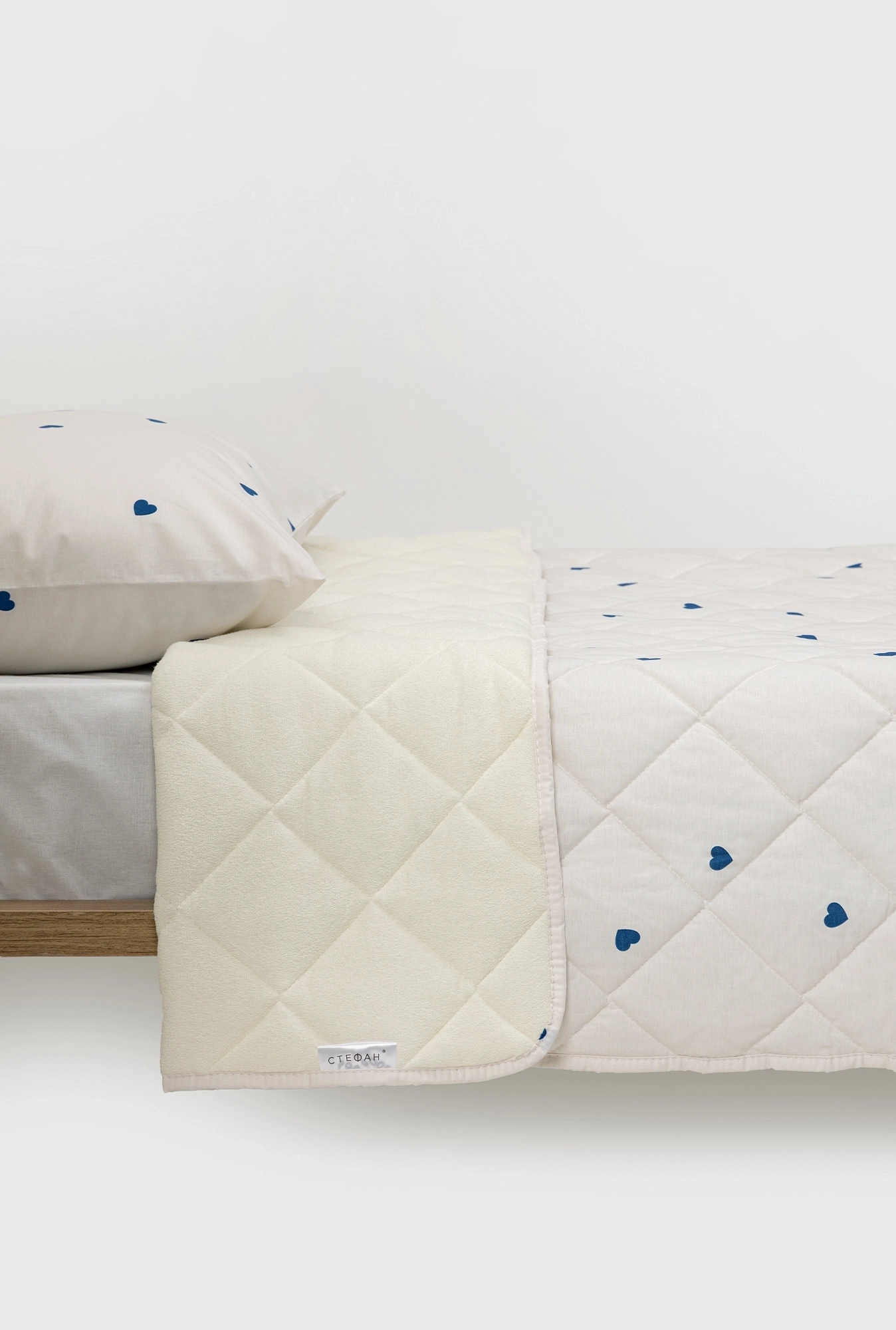 Štep deka Plava srca na bež osnovi sa jedne strane 100% pamuk, sa druge streč frotir. Mekana, prošivena i praktična, dostupna u dimenzijama 140x200 i 200x200 cm.